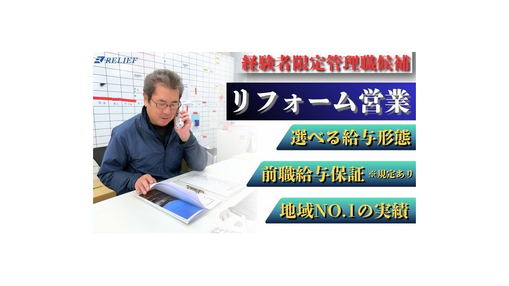 \年収900万円目指せる/ リフォーム事業部を取り纏める営業管理職を正社員募集! ※リフォーム営業経験3年以上の方限定※ 【仕事内容】 リフォーム事業部を取り纏める営業管理職としての業務をお任せします ・クロージング ・現場管理(施工計画の立案とスケジュール管理) ・従業員の育成 ・リフォーム営業(簡易診断、見積作成、商談)等 |やりがい十分! ・営業戦略の立案や実行で、チームマネージメント力が身に付き 人や組織、そして会社の未来に影響を与えられる充足感や手応えを得られるお仕事です! ・売上目標に向け(ノルマ無)、 チーム一丸となって業務に取り組み 営業管理職として努力した結果を感じられます! ・キャリアアップを目指せる環境です ────────────────── RELIEF「営業管理職」の魅力ポイント ────────────────── ◆経験者応援・学歴不問 ◆年収900万円目指せる ◆週休2日・残業少なめ ◆社内イベント多数 ◆地域No.1実績♪施工実勢2,000件突破! ────────────────── |行動指針は「Enjoy」♪ 季節ごとのイベントもあり、社員同士の仲が良く 生き生きと仕事やプライベートに全力で取り組める環境です 社員一人ひとりが責任と誇りを持ち活躍中♪ お客様の喜びを間近で体感できる職場です! 【給与】 月給40万円~50万円 ※スキルや経験により変動有 ※試用期間6ヶ月(月給30万円~※弊社規定により変動有) 年収:480万円~840万円 ◎年収イメージ ・1年目年収イメージ:700万円 ・2年目年収イメージ:800万円 ・3年目年収イメージ:900万円 (※個人差があり/経験や実績により金額が下回る場合もございます) 【RELIEFについて】 建設業界では珍しい新しい取組みに積極的な リフォーム会社です!地域密着で安定成長中♪ 今期はさらなる売上拡大を目指しています! 各SNSも更新中! ▶Youtube:おっちーTV【足場工事会社(株)RELIEF】 ▶TikTok:ochechitv0 ▶Instagram:relief_0220 営業管理職に少しでも興味持たれましたら、ぜひご連絡ください♪ |