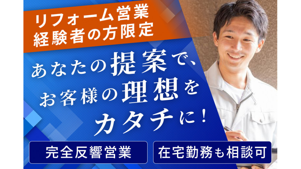 【必須】 ・リフォーム営業経験者 ・普通自動車免許(AT限定可) ★経験者応援/学歴不問 |