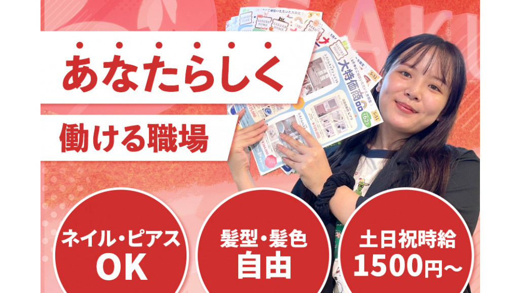 住宅リフォーム会社の受付スタッフをパート・アルバイト募集! \こんな方が向いてます/ ・事務職デビューしたい ・家庭と両立させながら職場復帰したい ・人と話すことが好き ・おしゃれも楽しみたい ――――――――――――――― 【おすすめPOINT】 ●週3日~・1日4h~OK ●土日祝は時給1500円にUP ●副業・WワークOK ●GW/夏季/年末年始/誕生日休暇 ●ネイル・ピアスOK/髪型・髪色自由 ★扶養内勤務可!長期休暇もあり無理なくご家庭と両立できます ★平日休みなので混雑を避けて公共機関への用事やお出かけも◎ ――――――――――――――― 私たちは従業員満足度向上を目指し日々労働環境を改善中 新たに仕事を始めたい方、腰を据えて仕事をしたい方にはピッタリの会社です! ――――――――――――――― 【仕事内容】 リフォーム会社の受付スタッフをお任せします ・電話や来店されたお客様の対応 ・簡単な資料作成 など ★テレアポはないのでご安心ください!まずは元気に挨拶から♪ お客様や社内の人に「ありがとう」と言われるお仕事です 【未経験・ブランクOK】 受付スタッフや建築業界が初めてでも大丈夫! 仕事のコツや進め方はOJTを通して丁寧に教えます 【職場環境】 受付スタッフは主婦(夫)パートさんが活躍中! 子育て中のスタッフも在籍しているので理解ある環境♪ コミュニケーションが活発な雰囲気です より良い職場環境を一緒につくりましょう! 【株式会社SAKURAとは】 リフォームや外装・屋根塗装等を手掛ける住まいのトータルサポーターです 設立から20年、フェアの開催やボランティアを通じて地元に根付き愛されています! 私たちと一緒に地域の皆様の安心生活を守りませんか? 一度話を聞いてみたい…など、 当社の受付スタッフに少しでも興味を持たれましたら、ぜひ一度ご応募ください! Instagramはこちら▷▷「@sakura__ltd」 |