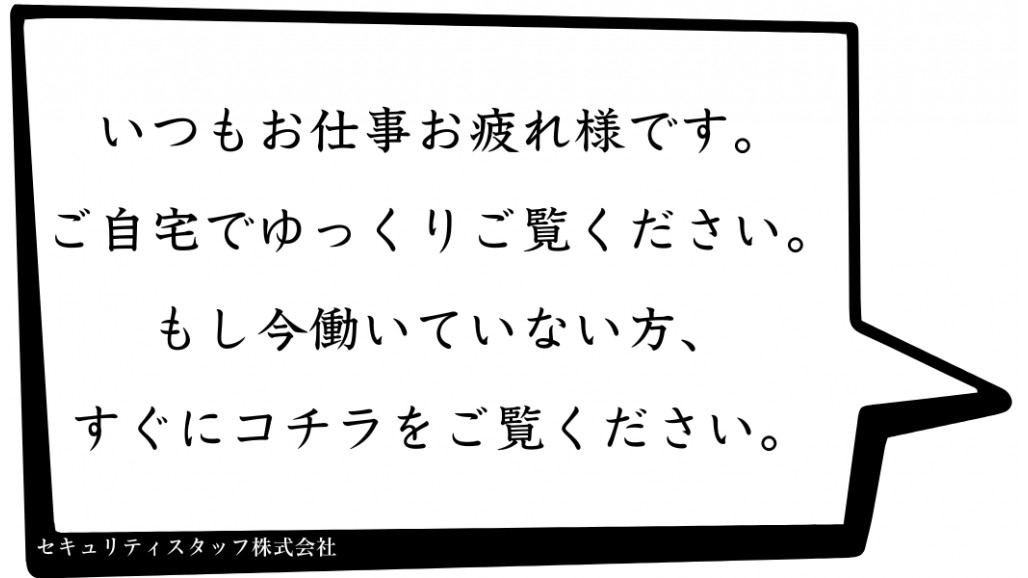 応募フォーム又はお電話にてご応募ください。 ■お電話からのご応募・お問い合わせ セキュリティスタッフ株式会社 電話番号:050-5538-5402 受付時間:9:00~17:00の間にお願いします。 ■WEBからのご応募 応募先へ進むを押してご応募ください。 |