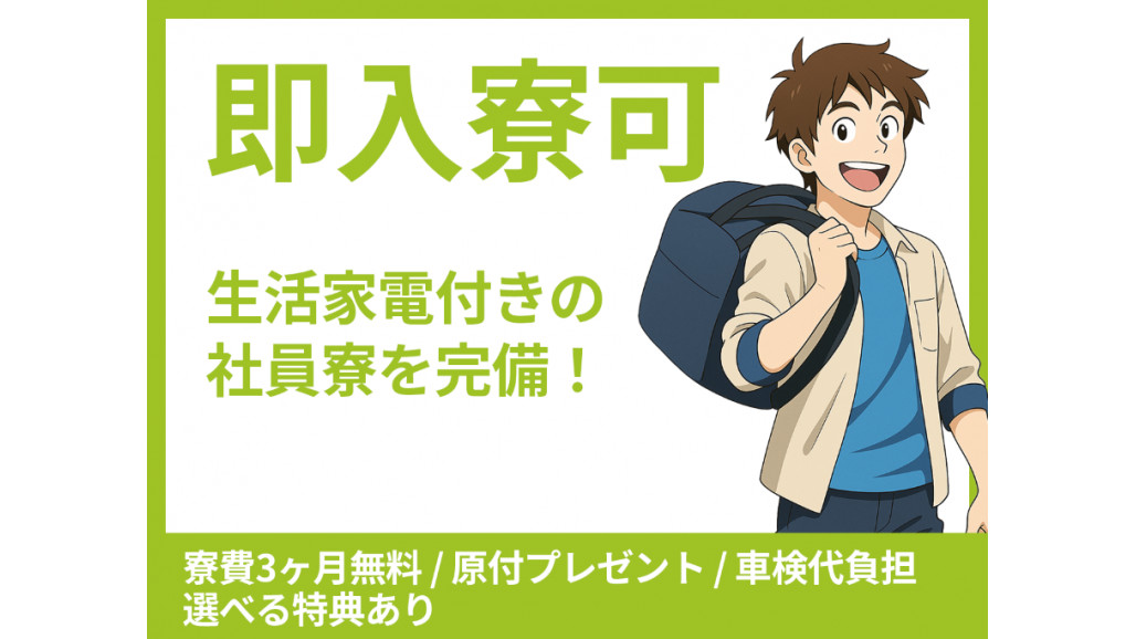 ■昇給あり(3ヶ月毎査定) ■資格取得支援制度 ■交通費全額支給 ■車通勤OK ■制服貸与 ■空調服支給 ■日払い、週払い可能【CYURICA】 ■携帯電話支給(スマートフォン) ■借金返済プログラム制度あり ■寮完備 ■髪型・髪色自由 |