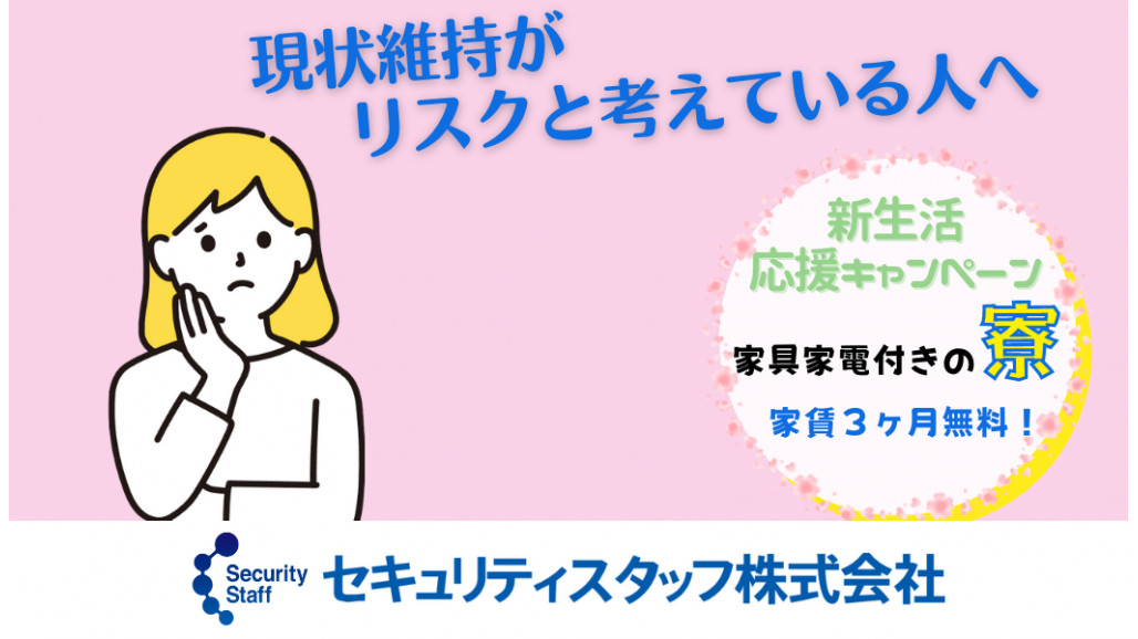 「そうだ 警備員、やろう!」のCMでお馴染み。 セキュリティスタッフ株式会社です! 商業施設や併設駐車場を定期的に巡回し、施設内外の安全を確認するお仕事です。 異常がないかをチェックし、安心できる環境づくりをサポートします。 【具体的な仕事内容】 ・施設内の巡回 ・車両の出入り管理 ・防犯カメラなどでの人の出入り管理 ※勤務場所と勤務内容は現場により異なります。 20代~70代までの幅広い年代の男女が活躍できる職場です。 ==================== 理想の職場を追求しています! ==================== 長く安定したキャリアを築いていただけるよう、 働きやすい環境の整備には力を入れています。 ✅直行直帰可! ✅現場が早く終わっても日給保証 ✅3ヶ月に1度、給与UPや昇格のチャンスあり! ✅全額会社負担で資格取得可能 ✅家具家電完備の寮に即入寮可! ✅最新のスマホを貸与 スマホで出退勤管理や位置確認が可能です! など、上記はほんの一例です。 ========================= ⭐数字で見るセキュリティスタッフ ========================= 一般隊員の最高月給 :33万円 最短終了現場 :5分(日給保証) 面接から入寮までの最短時間:1時間 最短昇給 :4ヶ月 最短隊長抜擢 :3ヶ月 最年少隊員 :18歳 最高齢隊員 :84歳 出戻り人数 :18人 交通誘導2級資格最短取得 :4ヶ月 公共事業と民間事業の警備業務の割合は50:50。 閑散期がなく年間を通じて安定して稼ぐことが可能です! 「即面接、最短1日以内のスピード採用」を実現する当社。 安定した新しいキャリアを、スピード感を持って全力でサポートします! ✅履歴書不要、WEB面接も可能! ✅面接交通費支給(¥1,000~¥2,000) ✅ご応募いただいた方と全員面接実施中! ✅入社日の相談可 ✅出張面接もOK! ※規定あり 【入社時プレゼントを贈呈中!】 下記より1つお好きな特典をプレゼントします! ・寮費3ヶ月無料 ・原付プレゼント ・車購入費用10万円補助 ・車検費用負担 新たなキャリアへの第一歩を、 早速踏み出してみませんか。 ぜひご気軽にお問い合わせくださいね! 【求人ID-KCH】 |