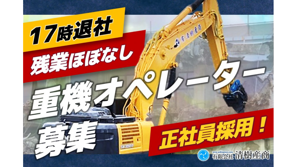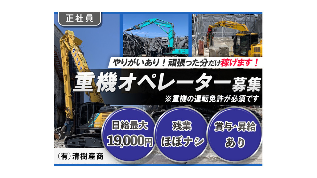 東海3県を中心に土木解体工事を行う有限会社清樹産商にて重機オペレーターを募集しています! 技術的なやりがいも、頑張りに応じた収入も、十分にあるお仕事です!特に重機オペレーターの経験がある方からのご応募をお待ちしております! あなたの力を当社で存分に発揮してみませんか! ■主なお仕事内容 建物の解体現場にて重機作業をお願いします。 【必須免許】 整地・運搬・積込・掘削を行う車両系建設機械 【優遇免許】 解体用の車両系建設機械 ※入社後に取得でもOKです! 【使用する機械】 油圧ショベル ============== こんな方にピッタリ ============== ✅重機オペレーションの経験がある人 ✅丁寧で慎重な操作ができる人 ✅体を動かすことが好きな方 ✅チームワークを大切にできる方 ============= 魅力的な勤務環境 ============= ✨頑張りに見合った報酬 あなたの働きが会社の業績に直結し、賞与(年2回)や昇給(年1回)によって還元されます! 「もっと技術を磨きたい」 「場数を踏んで早く成長したい」 「努力した分だけ評価してもらいたい」 そんなあなたの願いを、常に未来を見据える当社にて、ぜひ実現させてみませんか。 ✨ワークライフバランス重視 当社では残業ほぼありませんので、夕方以降の時間を有効に使うことができます! ・家族団らん ・趣味や習い事 ・友だちとの交流 などなど、プライベートが充実すること間違いなし!もちろん、残業が発生した場合はしっかり手当として支払いますのでご安心ください! =================== 地域社会の未来と安全を守る =================== ますます増える耐震対応の構造物を解体するためには、安全な施工と徹底的な現場管理が不可欠。 循環型社会の一員として、環境を考慮した経営を行っている当社で、一緒に働いてみませんか。 少しでも気になった方は一度ご連絡ください!受入れ体制万全で、お待ちしております!! ・-・-・-・-・-・-・-・-・ お電話でのご連絡はこちら ☎ 052-613-0349 ・-・-・-・-・-・-・-・-・ 【求人ID-JOP1】 |