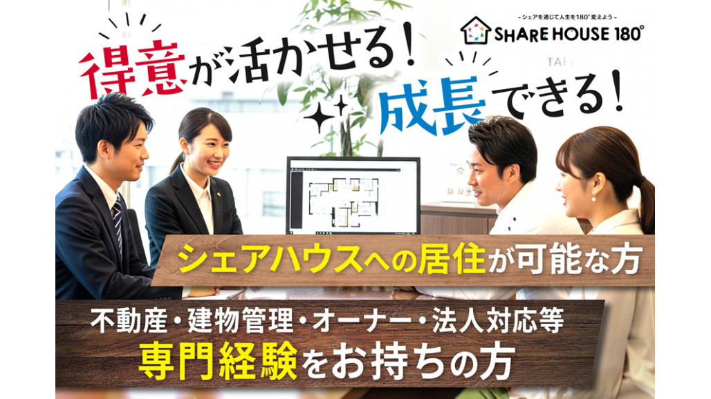 私たち「シェア180」は、全国で1,000室以上の物件を手掛けているシェアハウス運営会社です。 「シェアを通じて人生を180°変えよう」 このコンセプトのもと、提供しているのは、ただの「住まい」ではなく、人生のきっかけになる空間と体験。 入居者が日々の暮らしの中で価値観を広げ、人と出会い、変化していける——そんな場づくりに、私たちは本気で取り組んでいます。 今回は、そうしたシェアハウスづくりの運営を担う新スタッフを募集いたします。チームの中核としてのパフォーマンスを期待しています。 「現場目線」を大切にし、自ら考え、主体的に動ける方であれば、これまでの経験をフルに発揮しながら成長し、活躍できる環境です。 【シェア180のオススメPoint】 ・自由度と裁量のある働き方で、自分の「得意」を活かせる ・暮らしの現場に深く関わるからこそ、日々の変化と手応えを実感できる ・入社年次や経歴に関係なく挑戦できる、オープンで風通しの良い文化 ■具体的なお仕事内容 入居者対応や内覧、契約業務をはじめ、シェアハウスの運営・改善に幅広く関わる仕事など多岐に渡ります。だからこそ、あなたの得意や経験が「いろんなかたち」で活かされる環境です。 ・お客さまからの問合せ対応 ・入退去や内覧の案内、契約業務 ・シェアハウス巡回や企画、サポート ・広報活動(ブログ、SNS、HP等) ・入居者向けイベントの企画、立案 ・設備トラブル、ハウス内の対応 ・上記業務全般の品質改善・システム化 など ================== 暮らしの中に、学びと発見がある仕事 ================== 私たちのシェアハウス運営は、現場に住むことからはじまります。ただ住むのではなく、「感じる・考える・動く」。 入居者と同じ空間で過ごすからこそ、気づけることがある。 それが、より良い空間づくりや運営改善のヒントとなり、自分自身の成長にもつながっていきます。 【制度の概要】 ・シェアハウスに居住(最低1年間) ・住宅費はゼロ(水道光熱費のみ負担) ・1年後に別の住まいも選択可(規定あり) ▶︎住み続ける方には、滞在日数に応じて日当手当を支給!(1,000円/日)最大月30,000円相当の支給も可能です。(※滞在報告あり) ================== 現状維持ではなく、常に成長を! ================== 単なる事務作業でも、ただの接客でもありません。 私たちが求めているのは、「住まいを通じて人の人生を動かす」仕事に、自分で考え、言葉と動きで変化を起こし深く関わっていける人です。 これまでの経験を活かしながらも、役割や分野に縛られず、自らの枠を超えて改善や挑戦を重ねていく。 運営からスタートし、自分の得意分野・関心に応じて、業務の幅を広げていけます。 誰かに決められたルートをなぞるのではなく、自ら考え動くことで新たな仕事が生まれます。 「自分の強みをもっと発揮したい」「成長しながら社会に貢献したい」そんな想いを持つ上昇志向のあなたに、ぴったりの場所があります。 【こんな方は、きっと活躍できます】 ・自分で考え、行動に移すのが好きな方 ・暮らしや人に深く関わる仕事に魅力を感じる方 ・変化のある環境をポジティブに楽しめる方 ・自主的考え、学び、変化のある仕事をしたい方 あなたの中にある「やってみたい」や「もっと良くしたい」という気持ちが、そのまま力になる仕事です。 自分の「得意」が「価値」に変わる。シェアハウスならではのケミストリーを実感・体感できる働き方を、一緒にはじめてみませんか? ================= 「経験」×「シェア180」=「∞」 ================= これまでやってきたことが、次のステージで輝きを増す。自分を更新できる場所がここに。 下記いずれかの専門経験を生かし一緒に働いてくれる方を募集します。 ▼建物管理の経験 建物巡回・修繕管理などの実務を通じて、建物・設備・家具家電を常に最適な状態に保ち、オーナー・利用者双方の満足度を維持できる。 ▼法人営業・法人対応の経験 法人顧客への提案営業、契約交渉、アフターフォローまでを一貫して担当し、特に社宅や福利厚生としてのシェアハウスの社宅営業ができる。 ▼オーナー対応の経験 オーナーとの信頼関係を築きながら、稼働率向上の提案、修繕交渉、賃料調整など、物件の価値を高める。 ▼不動産業界出身の方 不動産関連知識や、 賃貸仲介やBtoC営業で培った提案・内覧・契約クロージングができる。 ▼業務改善・システム活用の経験 「このやり方、もっと良くできそう」そんな気づきが社内フローや仕組みの改善・効率化の実行力が全体の底上げへ繋がる。 経験者だからこそ、任せられる領域がある。自分の得意が、誰かの暮らしやチームの役に立つ。それを実感しながら働ける環境です。 【求人ID-SHR】 |
