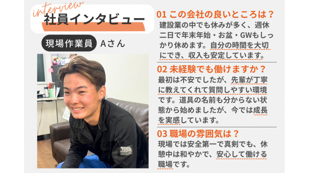 昇給(年1回) 交通費支給(規定内) 残業手当 深夜手当(日給1.25倍) 住宅手当(1万円/月) 資格手当(中型2万円,大型3万円/月) 借り上げ社宅あり(更新料会社負担) 死亡見舞金 退職金制度 研修制度 資格取得支援(全額支給) 車・バイク通勤OK(資材置き場まで) 作業着貸与 ひげOK/ピアスOK/髪型・髪色自由 WEB面接OK 社内イベント(社員旅行/忘年会) |