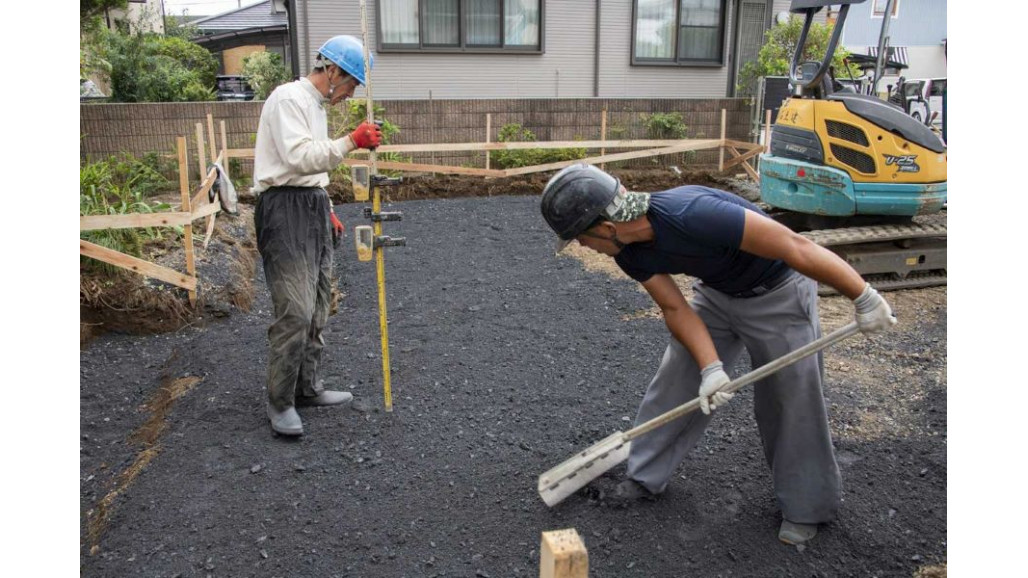 敷地内の建物位置の確認作業後、建物外周に木杭を打込み、レベルを使い設計上の基準高さと同じ高さで貫き板を使い建物の周りに囲いを作ります。 建物の外周部・内周部を貫板から深さを割り出し正確に掘り整地。