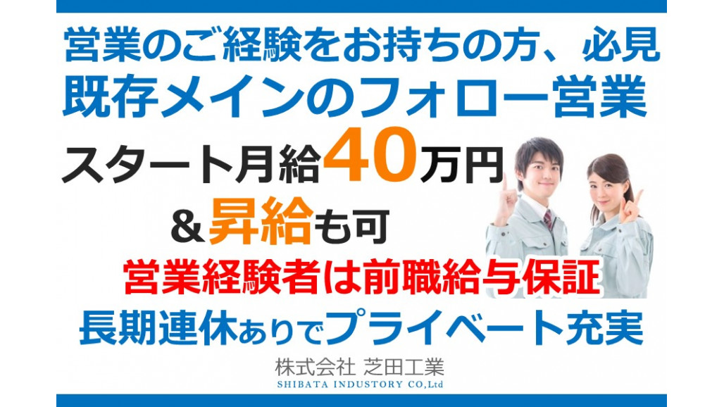 | 職種名 | 法人営業 給排水設備工事会社 完全週休二日制 土日祝日 長期連休あり 経験者 |