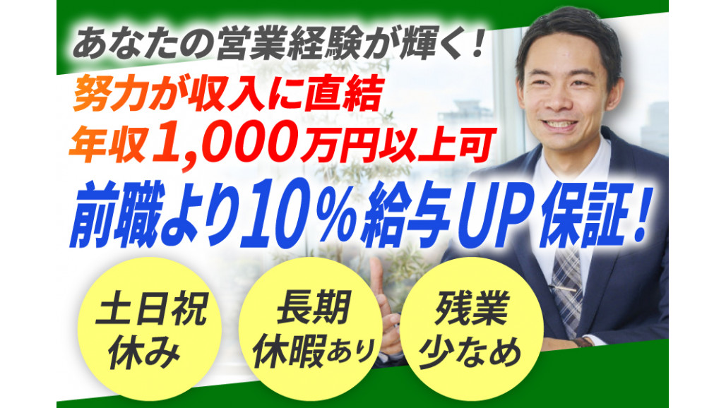 | 職種名 | 環境インフラや水関係プラントの法人営業 エキスパート採用 週休2日制 有給休暇あり |