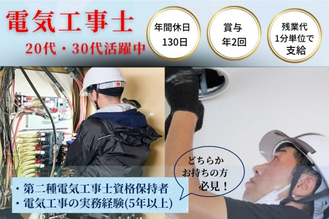 ※上記給与には見込み残業代67,663円~100,774円を含みます。 <その他手当> ■資格手当 ∟第2種電気工事士 5000円/月 第1種電気工事士 10000円/月 消防設備士甲種4類 2000円/月 ■家族手当 └配偶者 5000円/月 子 1名につき2000円/月 ■出張手当 └1泊3000円 ■住宅手当 ∟会社から2㎞以内に引っ越してきた場合、家賃の60%最大4万円を補助 ■休日出勤手当 会社命令で出社した場合、時間給以外に2000円 ※土日祝はほとんどなく年に数回あるかないかです |