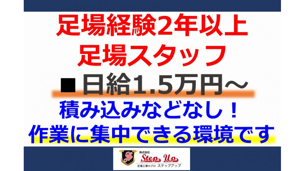 | 職種名 | 足場作業員 くさび足場の設置・撤去 経験者 即日勤務可 |