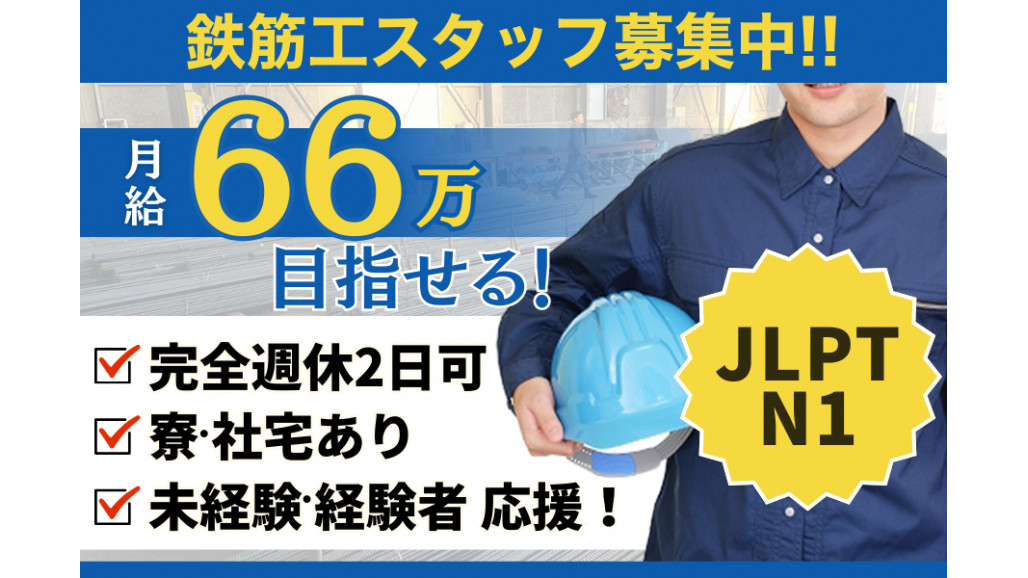 | 職種名 | 住宅の鉄筋工事スタッフ・賞与年3回日 完全週休2日可 寮社宅あり |