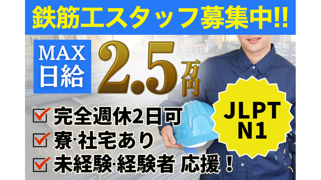 《応募される求職者の方へ一言》 あなたの率直なお気持ちお聞かせください!困ったことや、お悩み、悲しいこと、嬉しいこと、受け止めます。 少しでも興味を持っていただけたなら、まずは職場見学や職場体験からはじめていただくことも可能です。 当社で一緒に働けることを楽しみにしています!! 【ハローワークへの求人掲載について】 弊社の求人はハローワークに掲載していない案件が多数ございます。(ハローワーク求人掲載は期間が経つと自動的に掲載が止まるため)お気軽にお問い合わせください。 【このような方活躍】 建設、建築業界で鉄筋工(鉄筋工事、住宅基礎工事、鉄筋加工、鉄筋基礎工事、 建設作業員)として未経験から働きたい方。住宅基礎工事や鉄筋工経験者の方。完全週休2日可、日払い週払い(応相談)、社宅あり、入社祝い金あり、賞与年3回の建設業、鉄筋工事企業で鉄筋工として働きたい方。未経験、中卒、高卒、中高年層も活躍している職場で働きたい方。鉄筋工として正社員で働きたい方。鉄筋工を新着急募。鉄筋工、建設、鉄筋、日払い(応相談)、正社員。 求人ID【P-STK01】 |
