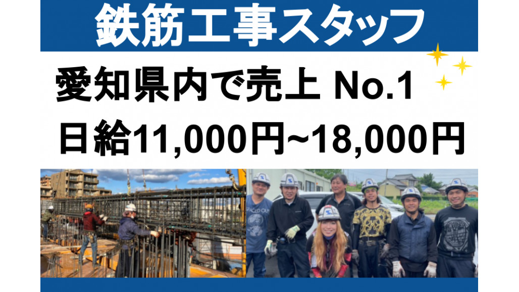 鉄筋工事の施工数や売上が愛知県トップクラスを誇る当社。今回の募集では、未経験の方を積極採用し育てていきたいと思っております。 【PRポイント】 ・様々な資格や技能講習が取得可 ・高収入が自慢!ガッチリ稼げます ・完全週休2日(土日)も土曜出勤も選べます ・会員制リゾートホテルが無料で楽しめます ※家族も無料で利用できる特典付き! ・独立も目指せます ■具体的な仕事内容 新築のマンションや物流倉庫などに関わる鉄筋工事(建設工事)をお任せします。未経験の方は、先輩スタッフのフォローや手伝いを通して徐々に覚えていってくださいね。 ・鉄筋の組立 ・機材の積込みや積み下ろし ・現場の清掃や後片付けなど 全くの未経験スタートの方は、道具の名前を覚えることろから、現場の流れ、作業のポイントまで、先輩スタッフがしっかりを教えていきます。 【現場エリア】 名古屋市を中心に愛知県内です。 ====================== なりたいカラダを手に入れよう ====================== 身体を動かしながら働くことが好きな方にぴったり! 「筋トレが日課になっている」「これからジム通いを始めたい」という方は必見です! しっかり稼ぎながら、自然とカラダを鍛えられるので、ジムに通わなくても理想のボディが目指せますよ! ======================= 稼ぎたい、休みたい、を選べます! ======================= 「家族のために、収入アップしたい」 「趣味に使うため稼ぎたい」など しっかり稼ぎたい方も、 「土日は家族と過ごしたい」 「プライベートは大事にしたい」など たっぷり休みたい方も、相談してください。希望の働き方を選べます。 福利厚生の一環として、社員・家族は5人まで無料で活用できる「リゾートホテル休暇」があります。リフレッシュに家族との思い出作りに、ご利用ください。 ================== 経験積んで、昇給、独立も ================== 資格取得したり、経験を積みかさねていくことで、しっかり昇給します。 未経験からスタートして、ゆくゆくは独立。毎月50万以上を稼いでいる先輩もいます。 ぜ日お気軽にご応募ください。 【求人ID-MKE】 |