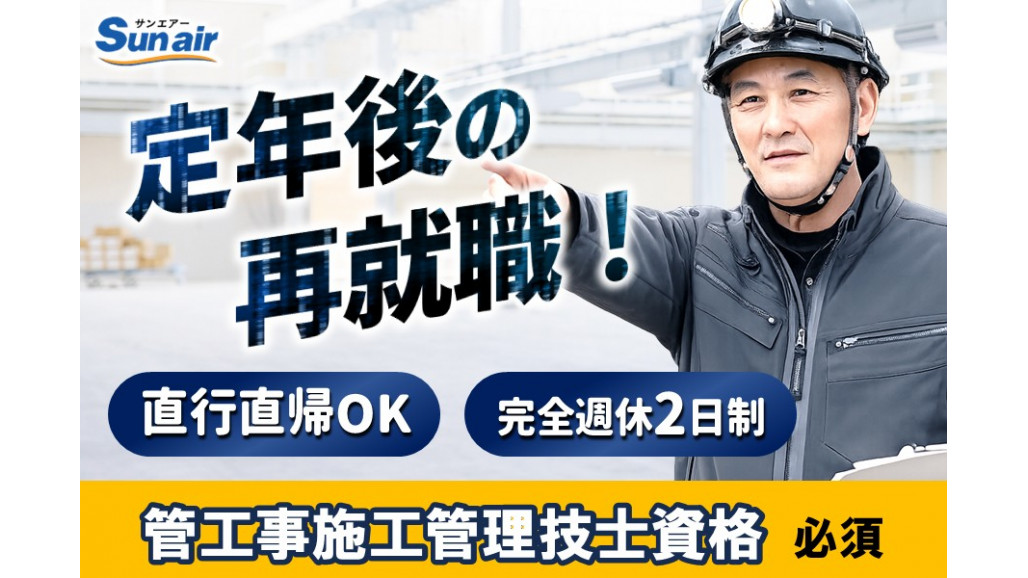 | 職種名 | 管工事施工管理技士 空調設備施工管理 資格あり・未経験OK 完全週休2日制 シニアOK 定年後活躍 |