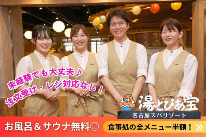⭐テーマパークのような銭湯で働こう! スーパー銭湯「湯~とぴあ宝」内のレストラン「おたから亭」でホールスタッフ大募集! お風呂・食事・映画・ゲームセンター・カラオケ✨ まるでテーマパークのような館内で、楽しく働きませんか? 「おたから亭」は、にぎやかな【大広間】と、大人の和空間【だいこくの間】に分かれた雰囲気のあるレストラン✨ ランチタイムも深夜帯も、あなたのライフスタイルに合わせて柔軟に働けます! ⭐ココで働くおすすめポイント⭐ ■週1日~OK、スキマ時間を有効活用できる! ■ 注文もレジもナシで未経験でも安心! ■美味しい賄い付き! 【具体的な仕事内容】 配膳などのホール接客業務をお願いします! ・注文はセルフオーダーシステムで簡単⭕️ ・レジ打ち&電話対応ナシ! 接客が初めての方でも安心して始められます。 ============ ✅待遇&働きやすさバツグン! ============ スタッフはお風呂やサウナが無料で利用可能! さらに、食事処の全メニューが50%OFFになる割引や美味しいまかない付きの特典もあり! またJR「笠寺」駅から徒歩7分で、車や自転車での通勤もOKです。 学生さん、Wワーカーさん、家事と両立したい主婦(夫)さん、体に無理なく働きたい中高年・シニアの方も大歓迎! 年齢や経験に関係なく、和やかな雰囲気で働ける職場です✨ 週1日から勤務OKで、22時以降は深夜手当、土日は時給アップと効率よく働ける環境です。 働き方はご相談ください! =========== ✅未経験でも大丈夫! 難しい作業は一切なし! =========== バイトデビューやブランクがある方も大歓迎です! 注文受けやレジ対応がないので、接客経験がなくても安心して働けます。 さらに、職場は清潔でキレイなので、快適な環境でお仕事ができますよ! =========== ✅就職活動にも役立つ! =========== ここでの経験を就職活動に活かすことが可能! 母体の宝グループでは、ホテル・交通・不動産などのインターンや職場見学にも参加できます。 グループ全体で新卒採用も行っており、幅広い業界で働けるチャンスがあります✨ 【求人ID-OTK】 |