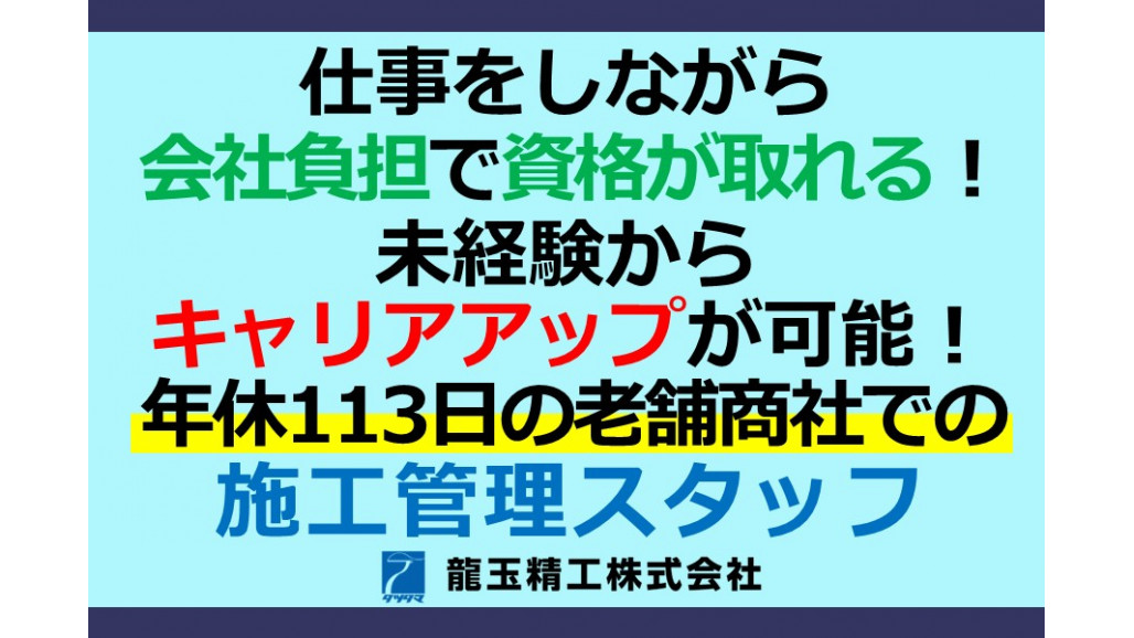 未経験から現場のプロになりませんか。まずは施工スタッフから始め、ゆくゆくは施工管理のお仕事をお任せしたいと考えています。 建設・建築業界、住宅設備業界の勤務経験、内装工や大工としての実務経験、水道工事、防水工事などの現場経験をお持ちの方、必見です。 電気工事士、給水装置工事主任技術者、液化石油ガス設備士、ガス可とう管接続工事監督者、といった各種資格取得を全面的に支援します。 建築施工管理技士や土木施工管理技士、建設機械施工技士などの資格を取得し、現場管理や現場監督に携わってみたい方はぜひご検討ください。 「残業少なめ」「転勤なし」「福利厚生充実」「資格取得支援あり」といった条件を希望しておられる方にもおすすめのお仕事ですよ。 ハローワークなどで「施工管理」「建設」関連の正社員求人を探しておられる方、新卒・第二新卒の方からのご連絡もお待ちしています。 |
