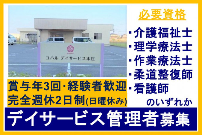 介護系の資格をお持ちの方、必見です。機能訓練型デイサービスにて施設長(管理者)をお願いいたします。 介護福祉士、理学療法士、作業療法士、柔道整復師、看護師など資格を生かすことができます。 また有料老人ホーム、デイサービスなどで管理者やリーダー、マネジメントの経験のある方もお力を貸してください。 当デイサービスは人柄重視。思いやりと感謝の心を持ち、地域の高齢者の方に寄り添ったアットホームな雰囲気の職場を目指しています。 介護施設やリハビリテーション施設での勤務に興味がある看護師・准看護師もご検討ください。ブランクがあっても大丈夫。まずは一度お話ししてみませんか。 ハローワークなどで「賞与あり」「完全週休二日制」の正社員のお仕事をお探しの方からのご応募もお待ちしています。 |