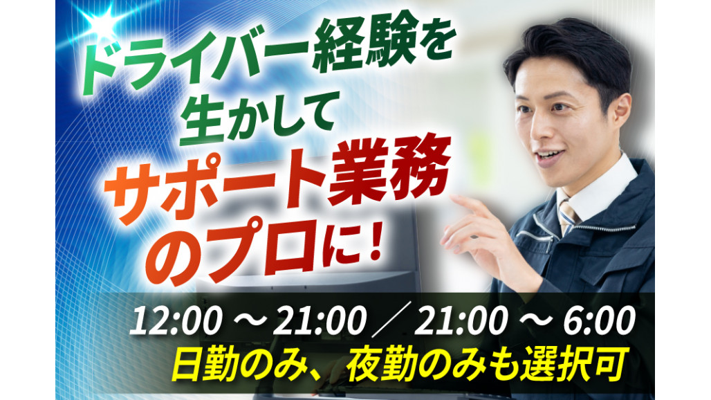 | 職種名 | デスクワーク中心のドライバー運行サポートスタッフ 未経験可 資格取得支援あり 週休二日制 |