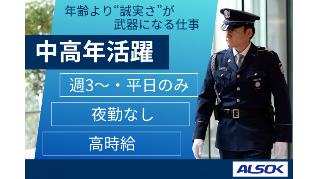 \年齢不問!セカンドライフに向けてアクティブに/ ────────────────── ▶週3日からOK!土日祝休み ▶日勤のみだから負担なく働ける! ▶雨でも安心の屋内勤務!空調完備 ▶年齢より“誠実さ”が武器になる仕事 ▶ALSOKグループの安心基盤 ────────────────── 「健康のため体を動かす仕事がしたい」など、 ALSOKでは中高年からシニアまで幅広い世代の方の志望動機を尊重します♪ 東京23区内を中心に、巡回警備スタッフの業務をお願いします。 ・出入管理:入館証の目視確認など ・巡回:パトロール、落とし物や迷子の発見 ・防災センター:監視カメラなどのチェック ▶配属施設は高層ビル/テレビ局/一流ホテル など 通勤にも便利な駅チカや駅直結の配属先多数! 【巡回警備スタッフの給与】 ・時給1,300円(日給:10,400円) Wワークで空いた時間を有効活用したい… フルタイムでガッツリ稼ぎたい… など 巡回警備スタッフとしての働き方はあなた次第♪ \警備業界が初めてでも大丈夫!/ お仕事開始前に日帰りの研修が4日間ございます。 30時間(4日間)×1,300円=39,000円支給※交通費別途 もちろん研修期間中の給与もお支払いします。 1つの施設につき、平均20名の巡回警備スタッフが配属! サポートし合いながら働ける環境です♪ 【職場環境について】 40代50代の巡回警備スタッフが活躍しています。 同世代のスタッフも多く、休憩中は情報交換をしながらリフレッシュできます♪ また、負担を最小限にする取り組みを実施中! 集中力を切らさないために、持ち場は1時間ごとの交代制です。 休憩スペース(仮眠室やシャワー室等)も完備★ 【ALSOK東京株式会社について】 CMでお馴染みのALSOKグループの一員です! 東京都内にある大型施設の常駐警備をメイン業務に据える当社は 不況に左右されにくい強固な経営基盤があります。 東京のランドマークとなる建物や、メガバンク、 数多くの施設において日々の「安全・安心」を支えています。 ────────────────── 応募経路によっては応募時に任意項目の入力を求められる場合がありますが、 必須項目のみで構いません。※任意項目は未入力でOK! セキュリティ業界に興味がある方、警備員としてご応募ください! |