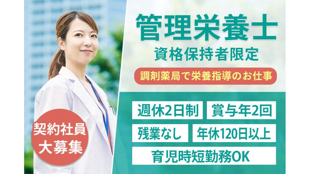 | 職種名 | 薬局の管理栄養士・業務未経験OK 週休2日 年休120日以上 残業なし |