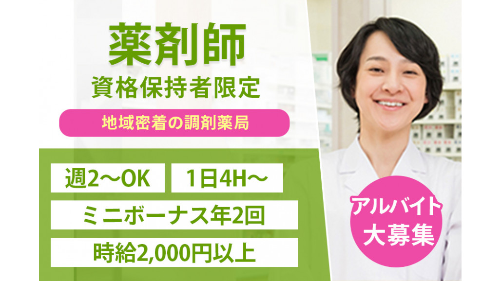 | 職種名 | 薬剤師 保険調剤薬局・週2~OK ブランク応援 ミニボーナス 時短勤務可 |
