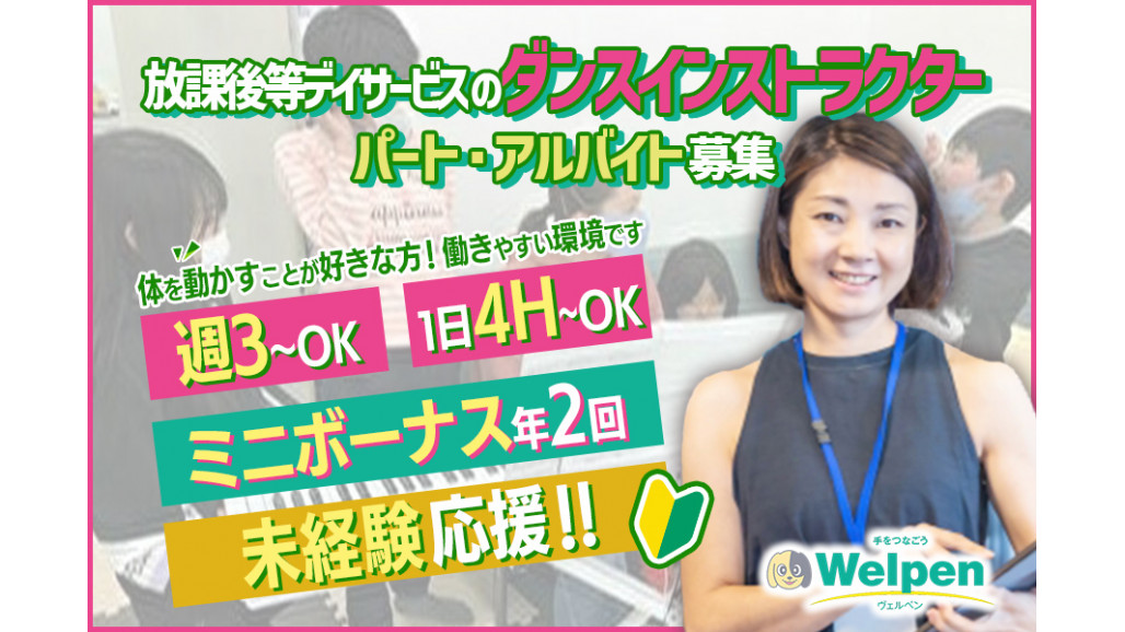 | 職種名 | 放課後等デイサービスのダンス指導者・1日4h~ 週3~扶養内勤務OK |