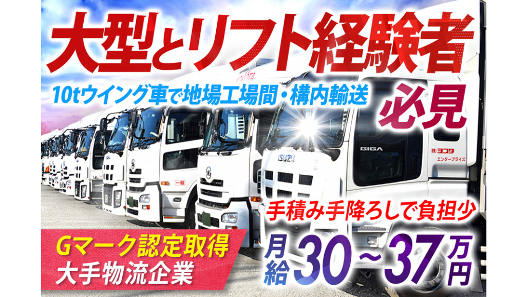 10t大型ウイング車に乗り、主に自動車部品の地場、工場間・構内での配送していただきます。 ✅最短3日で勤務開始可能! ✅1日1~5件の日帰り運行 ✅手積み手降ろしなし!負担少なめ ✅しかも高給与!月給約30万円~37万円 ▶トラックを徐々に新しくしています! ▶現場あがりの管理者なので、ドライバーに寄り添った体制となっています。 ▶▶Point 大手ECサイト物流部門やラストワンマイルを担う物流会社との直取引・定期便のビジネスを主に益々全拠点拡大に向け取り組んでおります。 ____________ ■具体的なお仕事内容■  ̄ ̄ ̄ ̄ ̄ ̄ ̄ ̄ ̄ ̄ ̄ ̄ 【使用車両】 ・10tウイング車 【取扱い荷物】 ▶配送物:自動車部品 ▶荷役方法: ・パレット積み中心 ・パレットの場合はリフトを使用 ・手積み手降ろしなし ※体への負担も少なめです! 【運行内容】 ▶配送件数:1日 1~5件 ▶運行形態:日帰り運行 ▶配送エリア: ・愛知県(豊田市・田原市など) ・三重県(いなべ市など) ※便の内容により若干変更の場合あり ※毎日ご自宅に帰ることができます! 【待機時間】 待機時間は10分~30分程度、長くても1時間ほど。その間は提出物の作成など、自由に時間を活用していただけます。 また、業務の都合で休憩時間が取れなかった場合も、別日の待機時間を活用してしっかり休憩を取っていただけるため、無理なく働ける環境を整えています。 時間の使い方に柔軟性があり、メリハリをつけて働けるのが特徴です。 ==================== \同業も、異業種も!/ どちらからのご応募もお待ちしています! ==================== 大型トラック免許およびフォークリフト免許をお持ちで、どちらも乗務経験のある方を募集しています。 荷役作業はパレット積みが中心で、フォークリフトを使用。手積み・手降ろしは基本的にないため、体力的な負担も抑えられます。 スタッフ同士助け合いが根づいた温かい雰囲気の中、腰を据えて長く働けます。 働きやすさと安定を両立できる職場で、お持ちの資格を活かして活躍しませんか? ==================== 2交代制シフトで安定収入を実現 ==================== 「6:00~」「15:00~」の2交代制勤務。勤務時間帯が比較的固定されているため、生活リズムを整えながら無理なく働ける環境です。 【こんな方におすすめ】 ・安定した収入を重視したい方 ・通勤や業務時の混雑を避けたい方 ・早朝・夜間の勤務に抵抗がない方 働きやすさと安定を両立できる職場で、お持ちの資格や経験を活かして長く働けます! ==================== 家族との時間も大切に考えています。 ==================== 当社では、「働く人の人生そのものを大切にしたい」という想いから、ご家族との時間をしっかり確保できる制度を整えています。 ■家族思いやり手当 家族との食事や外出、両親への贈り物などに使う費用を、ヨコタが一部負担する制度です。「思いやり」の時間を会社が応援します。 ■記念日休暇 誕生日や結婚記念日など、人生の節目の日は休暇を取得することができます!大切な日は仕事のことは気にせず、家族と安心して過ごせるように会社がサポートしています。 社員の間でも「ヨコタらしい制度」として活用する人が年々増えています。 家族との絆を深めながら働けるヨコタで、新しいスタートを切ってみませんか? 【求人ID-SDR】 |