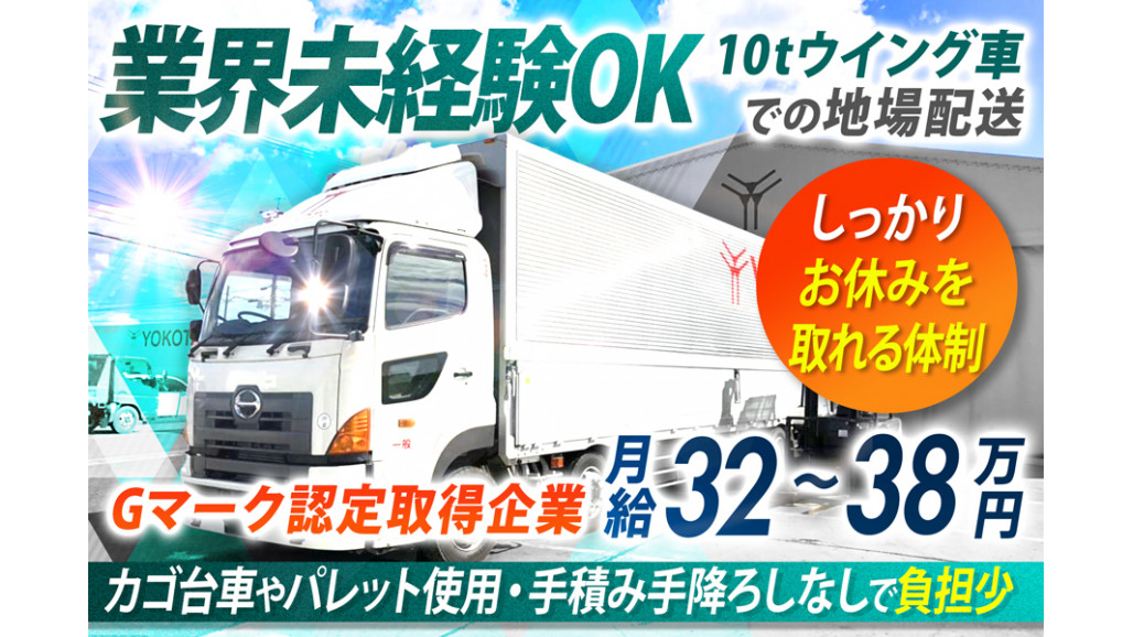 10t大型ウイング車に乗り、主に自動車部品を東海3県エリアへ配送していただきます。 外国籍スタッフも多数活躍中!多様なメンバーが在籍する働きやすい環境です。 基本的に【土日休み】 ワークライフバランス重視派にオススメ! ✅業界未経験積極採用中! ✅最短3日で勤務開始可能! ✅しっかりした研修制度あり! ✅運行管理者などのキャリアアップも可能 ✅借り上げ社宅制度あり!遠方からもぜひ! ✅日帰り/高速道路の利用など余裕のある配車 ____________ ■具体的なお仕事内容■  ̄ ̄ ̄ ̄ ̄ ̄ ̄ ̄ ̄ ̄ ̄ ̄ 10t大型トラックの 地場での工場間輸送のお仕事です。 【使用車両】 ・10tウイング車 【取扱い荷物】 ▶配送物:自動車部品 ▶荷役方法: ・カゴ台車やパレット積み中心 ・パレットの場合はリフトを使用 ・基本、手積み手降ろしなし ※体への負担も少なめです! 【運行内容】 ▶配送件数:1日 2~5回の往復運行 ▶運行形態:日帰り ▶配送エリア:例)東海3県 ※便の内容により若干変更の場合もございます。 ==================== プロドライバーとして成長し 次のキャリアにも挑戦できる! ==================== ✅ 充実の研修で、ゼロからプロへ。 入社後は基本から丁寧に学べる研修をご用意。運転技術だけでなく、仕事への理解もしっかり深めながら、無理なくステップアップできます。 ✅ 「社内転職」でキャリアの幅を広げよう! 「もっと自分に合う仕事があるかも」――そんな想いにも柔軟に応えるのが当社の強み。 在籍したまま別職種へチャレンジできる社内転職制度があり、毎月の「ワークライフパートナー」との面談を通じて、キャリアの方向性をいつでも見直せます。 ======================= 日常的にしっかり休める体制 「しっかり休む」も、大切な働き方。 ======================= ■基本的に【土日休み】が嬉しい! ■ムリのない配車・高速道路利用 ■長時間労働ナシで、心にも時間にもゆとりを しっかり休んでしっかり働くが基本。「自分を整えられる毎日」をつくる職場です。 =================== 休暇制度も充実しています! =================== ▶「記念日休暇」大切な日をしっかり満喫! 誕生日や特別な日は、仕事を忘れて自分のための時間をしっかり確保。心もリフレッシュして、また前向きに働ける環境を整えています。 ▶家族思いやり手当 両親とご飯を食べるときなど、家族のために使うお金を、ヨコタが一部負担する制度です。「人と人のつながり」を大切にする思いから、活用する社員が増えています。 ・趣味を楽しむ ・自己啓発に挑戦する ・ただのんびり過ごす あなたの時間を、もっとあなたらしく使える職場で、一緒に働きませんか? =============== 安全性優良事業所に認定! 【Gマーク取得企業】 =============== 当社は「安全第一」の姿勢を徹底し、国からも高く評価されています。Gマーク(安全性優良事業所)認定のもと、従業員が安心して働ける職場環境づくりに日々取り組んでいます。 「安全が守られてこそ、いい仕事ができる」 その思いを大切に、これからも安全と信頼を積み重ねていきます。 【求人ID-SDR】 |