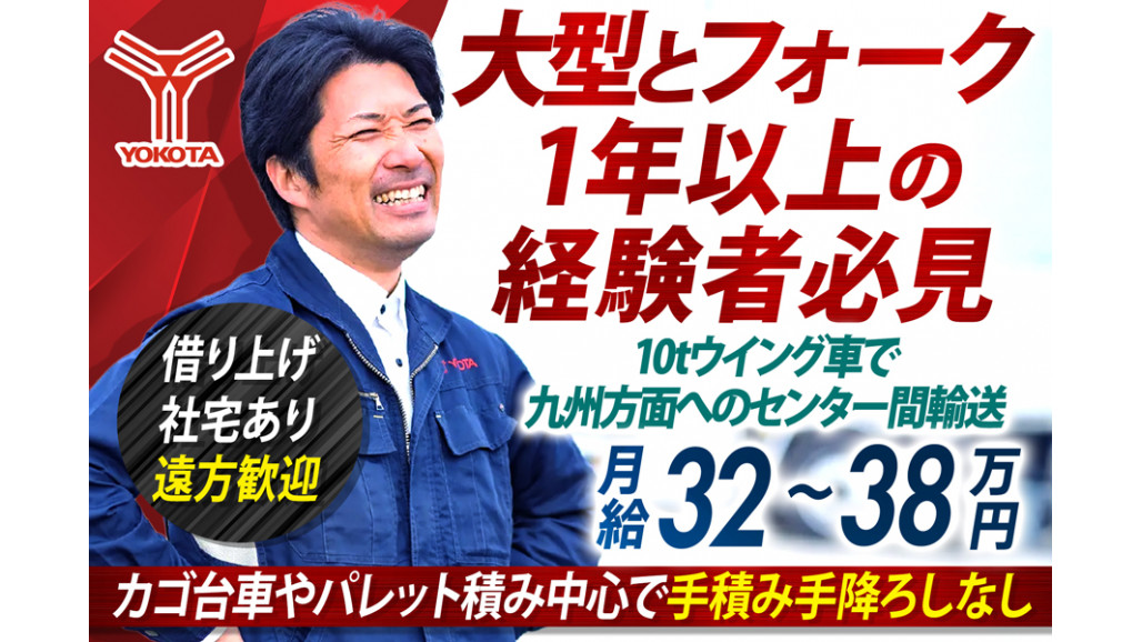 10t大型トラックの中長距離でのセンター間輸送(定期便・フリー便)をお任せします。 \ヨコタで正社員ドライバーになりませんか?/ ■実務経験を活かした転職にオススメ! ■人間関係の良さが自慢。分からないことも気軽に聞ける環境です。 ✅最短3日で勤務開始可能! ✅長く腰を据えて働ける会社 ✅安全第一!Gマーク認定取得企業 ✅高速道路の利用や余裕のある配車で安心 ____________ ■具体的なお仕事内容■  ̄ ̄ ̄ ̄ ̄ ̄ ̄ ̄ ̄ ̄ ̄ ̄ 一般貨物のセンター間配送をお願いします。 配送件数は3件程度で、2日運行になります! 【使用車両】 ・10tウイング車 ※全て新車 【取扱い荷物】 ▶配送物:一般雑貨 (ECサイト、大手宅配会社の商品、飲料など) ▶荷役方法: ・カゴ台車やパレット積み中心 ・パレットの場合はリフトを使用 ・手積み手降ろしなし ※体への負担も少なめです! 【運行内容】 ▶配送件数:1日 3件程度 ▶運行形態:2日運行など様々 ▶配送エリア:例) 九州(福岡県 久留米市など) ※便の内容により若干変更の場合あり ※配達が遅れる場合は、荷主様に各自で連絡を入れていただきます。 ==================== 「ここを最後の転職先にしたい」 そんな気持ちで入社される方が多数在籍。 ==================== ▶現場の声を反映した職場づくりをしています! ・丁寧なサポート体制 ・無理のない運行スケジュール ・体への負担を抑えた業務内容 \将来を見据えたキャリアの選択肢/ 毎月の「ワークライフパートナー」との面談を通じて、自分に合った働き方を相談できます。 配車・運行管理などへのキャリアチェンジも可能で、これまでの経験を次のステージで活かしていける職場です。 ==================== 特に「家族との時間」を大切に考えています。 ==================== 当社では、「働く人の人生そのものを大切にしたい」という想いから、ご家族との時間をしっかり確保できる制度を整えています。 ⭕記念日休暇 誕生日や結婚記念日など、人生の節目をしっかり祝う日に。大切な日に仕事を気にせず、家族と過ごせるようにサポートしています。 ⭕家族思いやり手当 家族との食事や外出などに使える手当もご用意。 両親と食事に、ちょっとした贈り物をしたり―そんな「思いやり」の時間を会社が応援します。 社員の間でも「ヨコタらしい制度」として、活用する人が年々増えています。家族との絆を深めながら働ける、そんな環境で新しいスタートを切ってみませんか? 【求人ID-OKY】 |