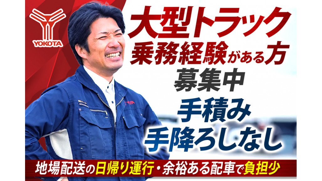 ✅19時スタート \大型ドライバー募集!経験者必見!/ 大型トラックの実務経験を活かした転職に。長きにわたりご活躍いただける環境でお待ちしています! ✅最短3日で勤務開始可能! ✅借り上げ社宅制度で生活基盤を安定! ✅プライベートも充実!長期休暇あり〇 ✅業務量が安定!需要高い配送業務 ✅月収約30万円~35万円 ____________ ■具体的なお仕事内容■  ̄ ̄ ̄ ̄ ̄ ̄ ̄ ̄ ̄ ̄ ̄ ̄ 主に自動車部品の構内輸送していただきます。 【使用車両】 ・10tウイング車 【取扱い荷物】 ▶配送物:自動車部品 ▶荷役方法: ・パレット積み中心 ・パレットの場合はリフトを使用 ・手積み手降ろしなし ※体への負担も少なめです! 【運行内容】 ▶運行形態:日帰り運行 ▶配送エリア:伊丹市 ※便の内容により若干変更の場合あり ===================== 長く安心して働ける理由があります! キャリアの選択肢・しっかり管理された制度 ===================== 社会保険や有給休暇、労働時間の管理など、基本の制度をしっかり整備。安心して長く働くために確認しておきたいポイントです! さらに、在籍のまま職種を変えられる「社内転職」制度も導入。 「もっと自分に合う仕事があるかも…」そんな想いがあれば、毎月の「ワークライフパートナー」との面談で気軽に相談できます。 ===================== 経験を活かして転職を! 【夜間勤務/月給30~35万円】 ===================== 大型トラックの乗務経験を活かし、安定を実現できる環境です。 勤務は【19:00~翌4:00】。夜間の仕事だからこそ効率よく働き、確かな収入につながります。 【必須経験】 ・大型トラックの乗務経験 資材運搬・重機輸送・自社便ドライバー・イベント専属など、他業種からの転職者も多数! 夜間でしっかり稼ぎたい方に選ばれている職場です。 「経験を無駄にせず、収入をもっと伸ばしたい」──その想いを叶えられるお仕事です。 ===================== しっかり休んで、しっかり働く ===================== ムリのない運行スケジュールや、休みもしっかり取れる体制。 高速道路の活用や余裕のある配車体制で、心身に無理のない働き方を実現しています。 家族との時間や趣味の時間もきちんと確保できるよう、会社全体でサポートしています。 ================= ヨコタエンタープライズ ~社会のため、夢実現のため~ ================= 産業界の人手不足や後継者問題を解決し、日本、そして世界の明るい未来に貢献するため、成長し続ける企業を目指します。 幅広い製品を扱うことで景気に左右されにくい経営基盤を確立しており、現在では大型トラックを中心に250台の車両が運行しています。 また、社員の安心・安全が物流事業としての安心・安全につながるという観点から、Gマークの取得、的確な配車対応、全線高速道路の使用にも力を注いでいます。 一人ひとりが安心・安全に業務に取り組むことで、お取引先様の製品も早く安全に運べるように日々努めています。 【求人ID-KSD】 |