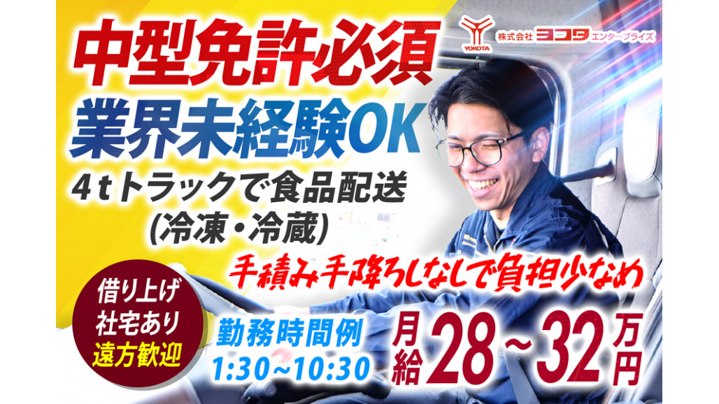 \4t中型トラックドライバー/ 主にディスカウントスーパーの食品(冷凍・冷蔵)の地場の店舗配送をお願いいたします! ✅業界未経験積極採用中! ✅最短3日で勤務開始可能! ✅安定給与!月収約28万円~32万円 ✅手積み手降ろしなしで負担少なめ ✅滋賀県内や神戸・大阪・京都・滋賀への日帰り運行 ▶▶Point 大手ECサイト物流部門や、ラストワンマイルを担う物流会社との直取引・定期便のビジネスを主に、益々全拠点拡大に向け取り組んでおります。 ____________ ■具体的なお仕事内容■  ̄ ̄ ̄ ̄ ̄ ̄ ̄ ̄ ̄ ̄ ̄ ̄ 4t中型トラックの中距離店舗配送(冷凍・冷蔵) ※安心の日帰り運行 【使用車両】 ・4tチルド車 【取扱い荷物】 ・配送物:食品(冷凍・冷蔵) ・荷役方法:カゴ台車 ・手積み手降ろしなし ※体への負担も少なめです! 【運行内容】 ・配送件数:1日 4~5件 ・運行形態:日帰り運行 ・配送エリア:例)神戸・大阪・京都・滋賀 ※便の内容により若干変更の場合あり ※基本高速道路を使用しますが、一部下道もございます 【おすすめポイント】 空調設備のある出荷センターなので夏場は涼しく快適です。 ===================== 景気に左右されにくい「食」の安定した需要 長期的に安心して働くことができます。 ===================== ・扱うのは生活に欠かせない食品 ・ECサイトでの取扱量の拡大 ・今後も一層の拡大が見込まれる 長きに渡り安定して活躍できる、食品配送のお仕事を始めてみませんか? ECサイトやラストワンマイルに加え、定期便の継続などで拠点拡大中の大手物流企業で「長期安定」が叶います。 \家族も応援してくれる転職を/ 配送に関する研修をしっかり行ってからのドライバーデビュー。 「安全管理は一切怠らない」という当社の姿勢は、働くあなただけでなく、見守るご家族にも安心を届けます。 ===================== 明るいうちに帰れるって、意外と快適。 ===================== 早朝スタート(例:1:30~)で、残業をしても日が高いうちに帰宅できる働き方です。 「朝が早いのはちょっと不安…」という方もご安心を。交通量の少ない時間帯だから、渋滞に悩まされることもなく、配送もスムーズ。 効率よく仕事を終えて、午後は自分の時間をゆっくり楽しめます。 趣味や家族との時間をしっかり確保でき、生活リズムも整いやすいのがこの働き方の魅力ですよ。 早朝勤務を経験したことがない方も、きっと「この働き方、意外といいかも」と思っていただけるはずです! ==================== 長く働ける理由は 「ジョブチェンジ」があるから。 ==================== ドライバーとしてキャリアを積んだ後も、あなたの「これから」に合わせて働き方を変えられる ——それが当社の大きな強みです。 「体力的に内勤に移りたい」 「経験を活かして別のポジションに挑戦したい」 そんな想いに応えられるよう、在籍のままジョブチェンジが可能な制度を整えています。 定期的に行う「ワークライフパートナー面談」で、あなたの希望や将来設計をしっかりサポート。 「今の働きやすさ」も、「この先の安心」も手に入る。長く腰を据えて働きたい方にこそ、選んでほしい職場です。 ご応募、お待ちしています。 【求人ID-RKT】 |