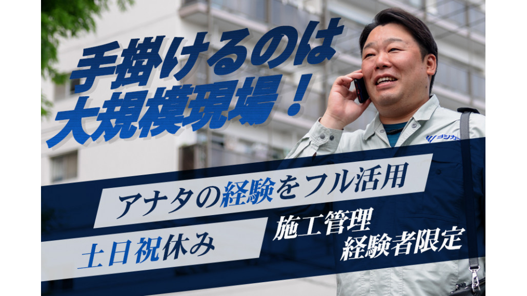 | 職種名 | 建築施工管理 経験者・土日祝休 高収入を目指せる 安定企業 寮社宅あり |