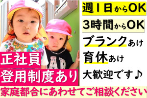 保育士の募集です。保育士免許をお持ちであれば現場経験、ブランクは問いません!新卒・第二新卒の方もぜひご応募ください! 保育所や企業主導型保育所、認定こども園、託児所などで保育士として勤務経験のある方は即戦力としてご活躍いただけます。 院内保育士や病棟保育士として病院内保育に携わっておられた方、企業内保育、派遣保育士のお仕事に興味がある方も、ぜひご応募ください。 学童保育や放課後児童クラブ、幼児教育施設など子どもに携わるお仕事をしていた方も、ご検討いただけませんか。 幼稚園でのお勤め経験のある幼稚園教諭の方も大歓迎です。20代、30代、40代中心の年代の保育スタッフが活躍できる職場です! ハローワークを通しての「ブランクOK」「残業無し」の正社員の保育士をお探しの方からのご応募をお待ちしています。 |